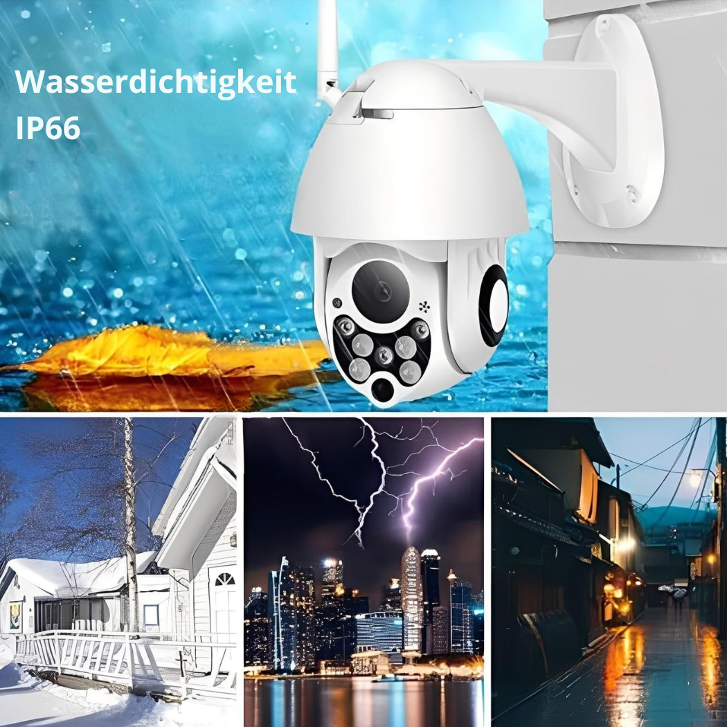 Ausgestattet mit einem wasserdichten Gehäuse (IP66), ideal für den Einsatz im Außenbereich. Erhöhen Sie die Sicherheit Ihres Zuhauses mit dieser WLAN-Überwachungskamera für den Außenbereich.